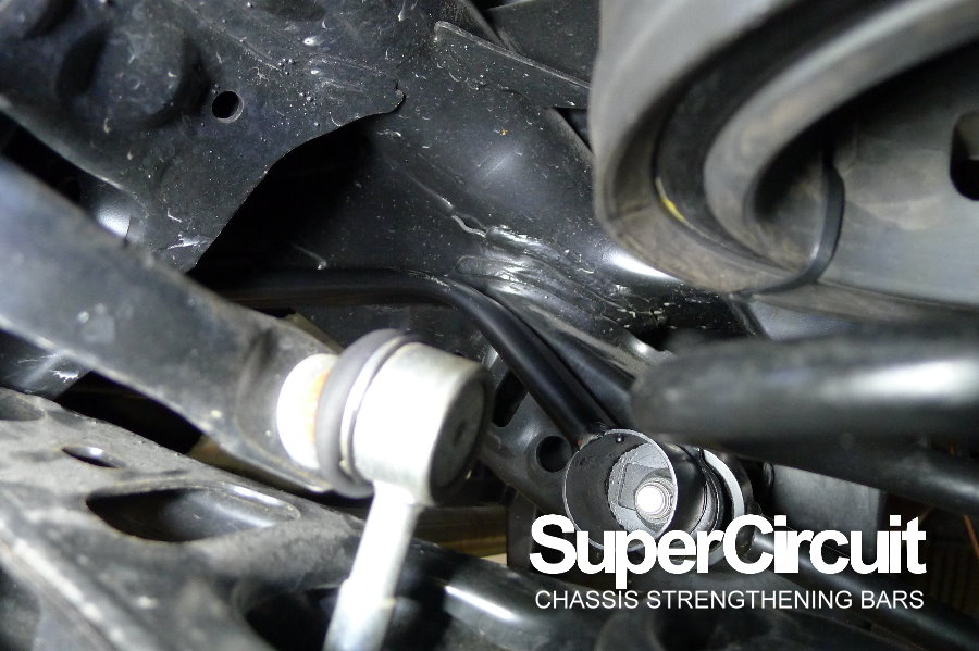 The SUPERCIRCUIT Front Lower Bar is designed to install at the two front sub-frame mounts as shown in the picture below.